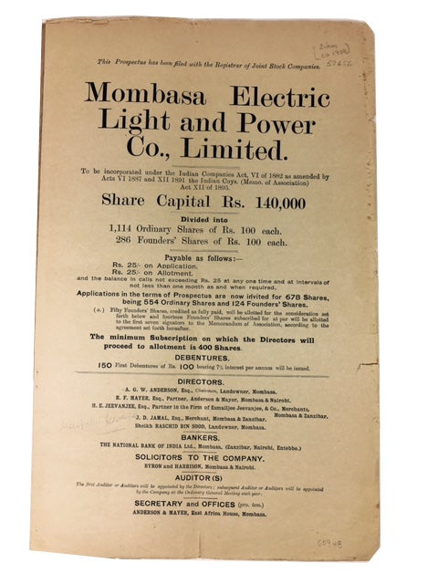 In 1908, a Mombasa-based merchant named Harrali Esmailjee Jeevanjee acquired the Sultan’s generator . Recognising the opportunity, he formed the Mombasa Electric Power and Lighting Company, with a mandate to provide electricity to the island city. In the same year, an engineer named Clement Hirtzel was granted the exclusive right to supply electricity to the fledgling town of Nairobi, leading to the formation of the Nairobi Power and Lighting Syndicate .