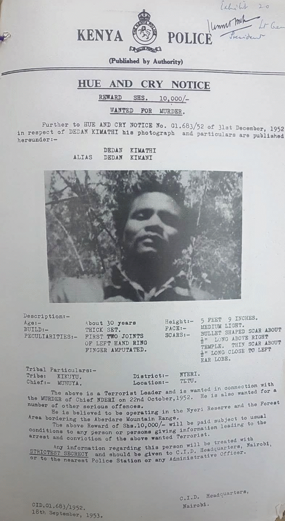Kimathi also used psychological warfare effectively. In a famous incident, learning that colonial authorities had no photograph of him (their most wanted man), Kimathi sent them a studio portrait of himself – bedecked in his dreadlocks and military regalia. This act was both taunt and propaganda: he was declaring that the colonial government could not hide his image or his cause from the public. British forces distributed “Wanted” posters with that portrait, inadvertently turning Kimathi into a legend. Indeed, British propaganda demonized him as the face of Mau Mau terror – a “scar-faced schoolteacher turned gang leader,” as one 1950s press piece described him. But among Africans, counter-narratives spread portraying Kimathi as a Robin Hood figure fighting for rightful land and freedom.