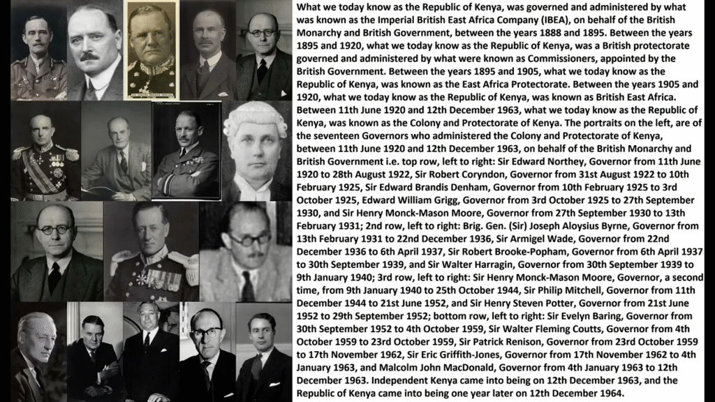 In July 1920, the British government formally transformed the East Africa Protectorate into the Colony and Protectorate of Kenya. This change marked the start of a new phase of colonial rule in which the governor represented the Crown, and settlers consolidated their political and economic influence. Between 1920 and independence in December 1963, Kenya’s administrative system evolved through phases of settler dominance, wartime mobilization, limited African representation, and authoritarian emergency rule. The colonial administration was headed by governors who each left their imprint on the colony, shaping structures that would later influence independent Kenya (Anderson, 2005).
