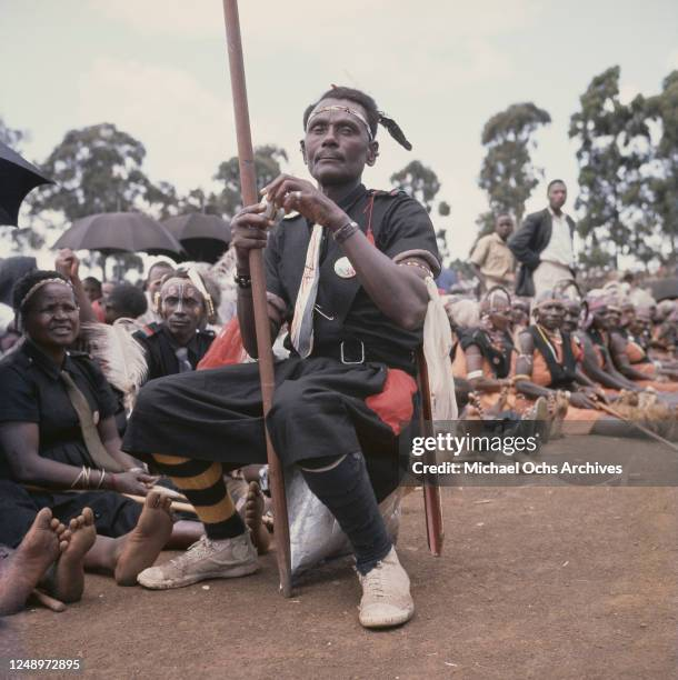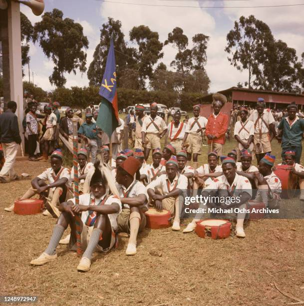 Supporters of the Kenya African National Union (KANU) gather after a symbolic gesture of surrender at the end of the Mau Mau Emergency. The ritual attire and dramatic hair crests reflect attempts at communal reconciliation after years of insurgency and detention. The event marked a transition from armed resistance to political negotiation, a theme explored in the history of the Mau Mau Uprising.