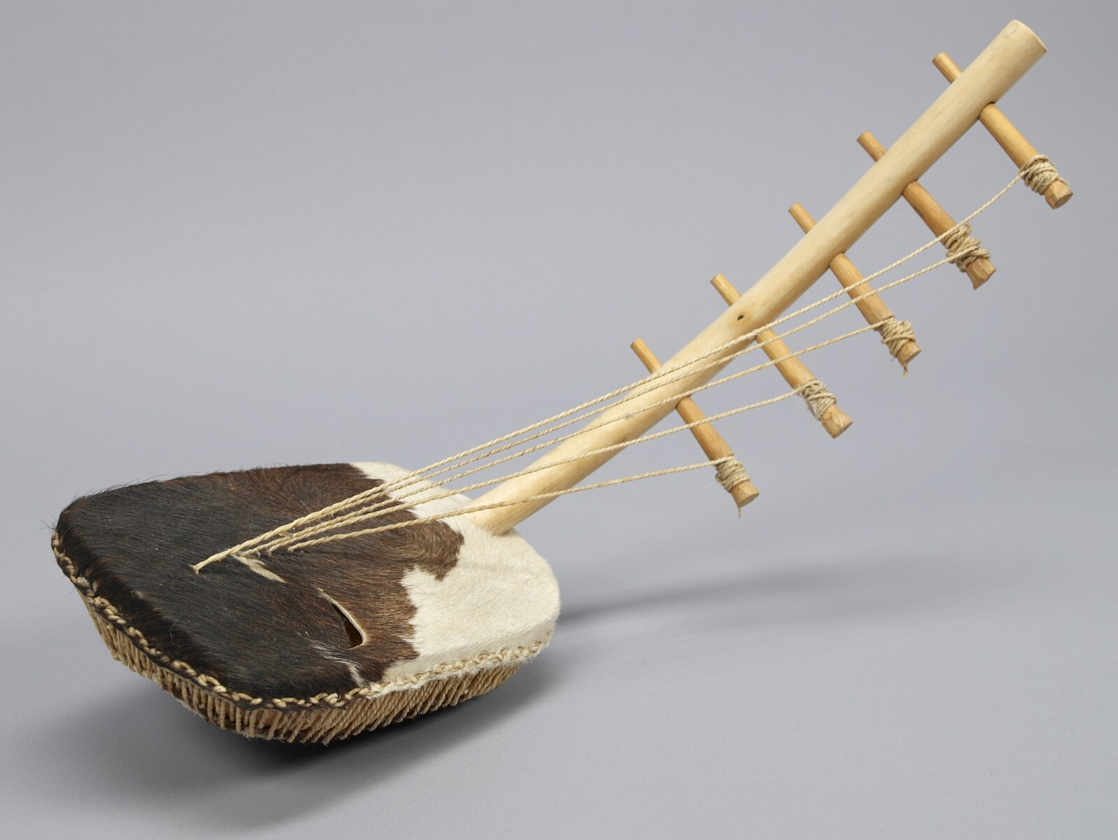 The open face of the wooden bowl is covered with animal hide — typically goat or cattle skin, dried and stretched tightly over the bowl and secured at the edges. This membrane is the instrument’s primary resonating surface: when the strings vibrate, the membrane amplifies the sound and gives the adeudeu its characteristic warm, slightly muffled quality. At the centre of the membrane there is a sound hole — a circular opening that allows sound to escape from inside the bowl, enhancing acoustic projection.