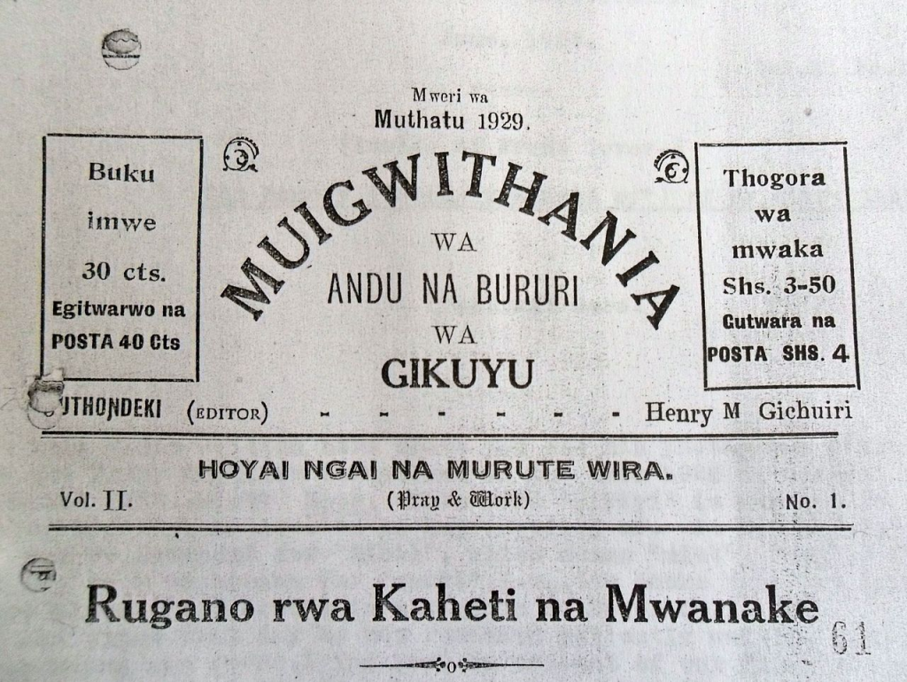 As Okeniyi notes, Muigwithania was a monthly with mixed content—advice, proverbs, and news items. It aimed “to promote African self-awareness” and to articulate the grievances of the Kikuyu people.¹⁵ It was published until the outbreak of World War II.