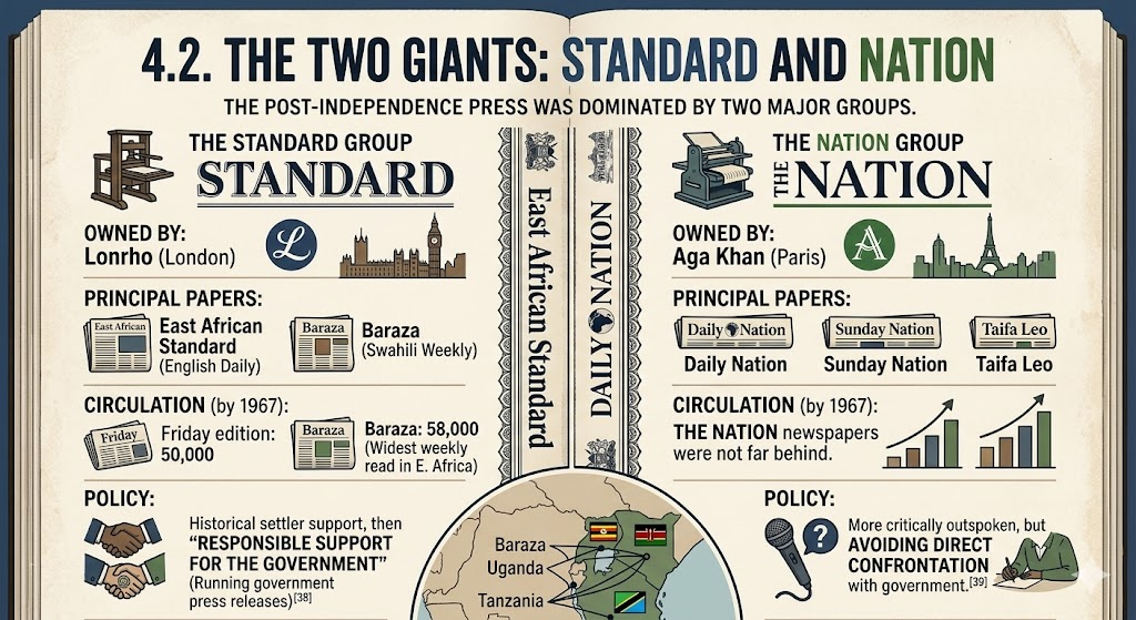 | 1963–1992 | Independence; foreign-owned press dominates; state controls electronic media | Lonrho (UK), Aga Khan (Switzerland/Paris), Kenyan government |