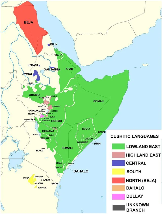 The Somali are a Cushitic-speaking people, part of a larger language family that includes the Oromo, Afar, and Rendille. Linguistic evidence suggests that the Somali and their closest relatives, the Afar, separated from other Cushitic groups at a very early date, establishing themselves in the northern Horn of Africa.²