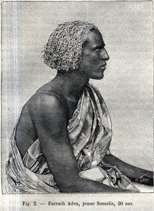 Farrach Aden, 20-year-old Somali people exposed in the Jardin d’Acclimatation in Paris, France. Old 19th century engraved illustration from La Nature 1890